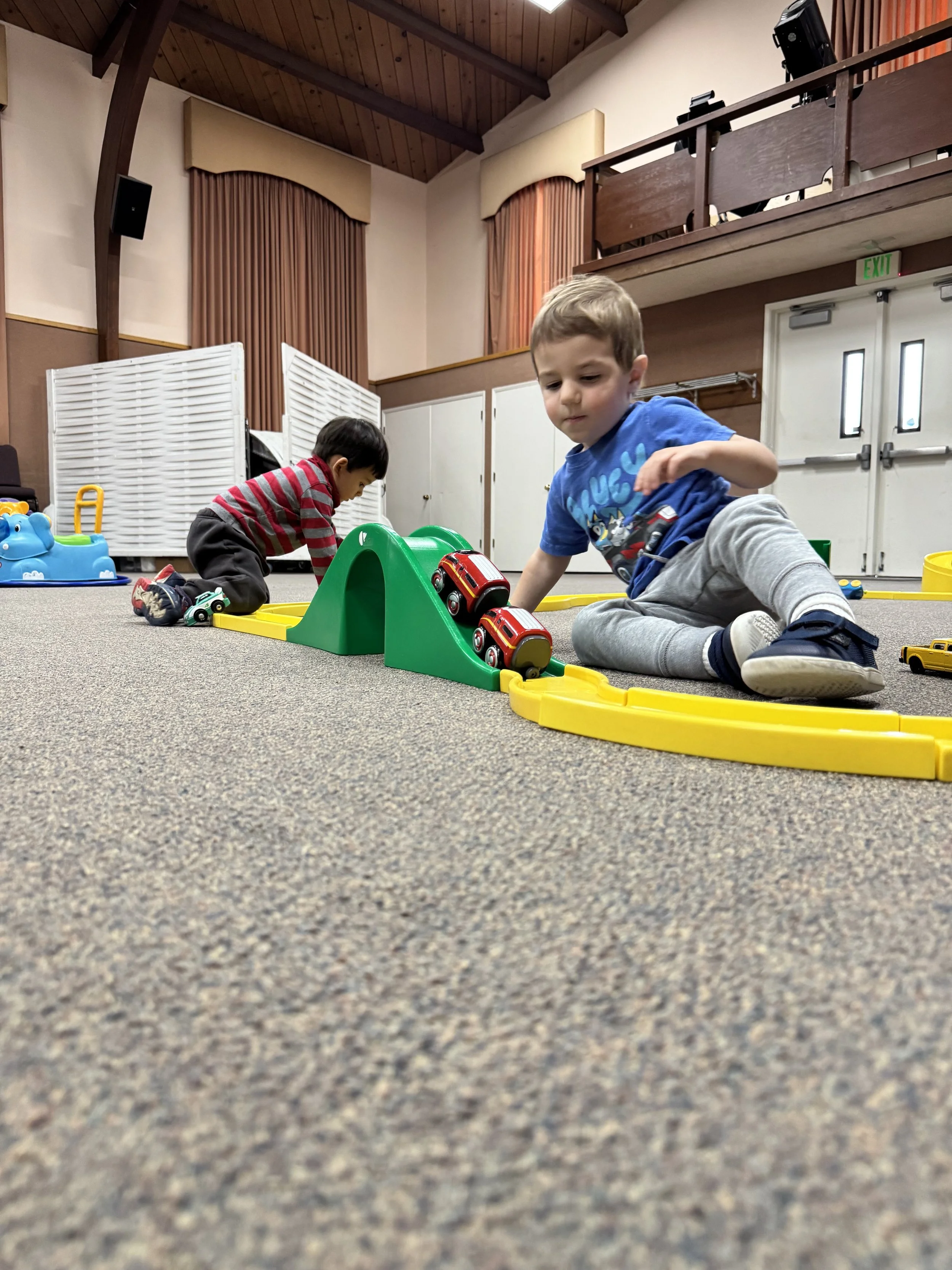 Lots of PLAY to follow our play-based curriculum. Lots of outside play, too (and a huge gym for cold or rainy days!)